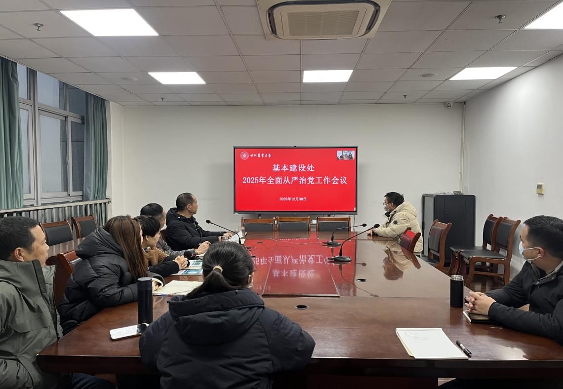 为深入贯彻落实学校全面从严治党工作部署,2025年12月30日下午,基本建设处在三校区处视频会议室召开2025年全面从严治党工作会议。处领导班子、在职人员19人参加会议。会议由党支部书记周玉华主持。